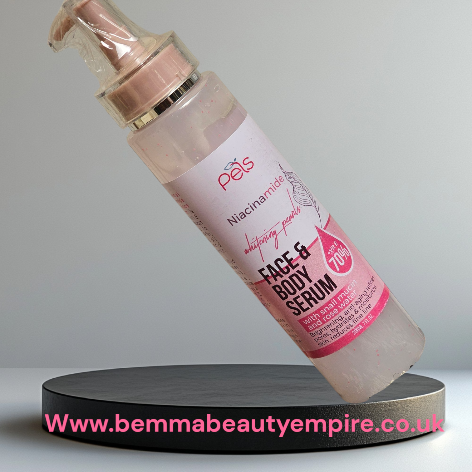Pels Niacinamide whitening Pearls face and Body Serum with snail mucin and rose water.
