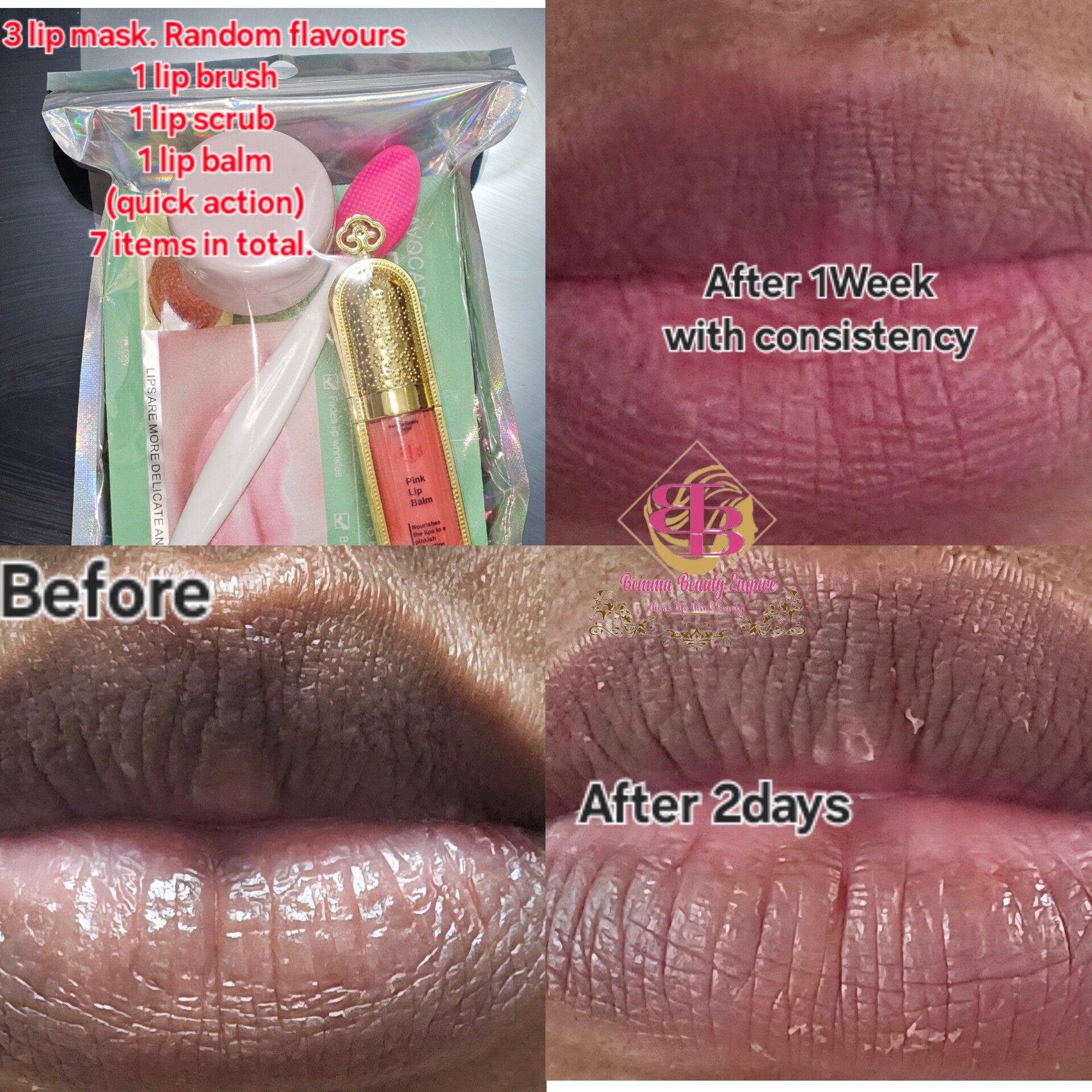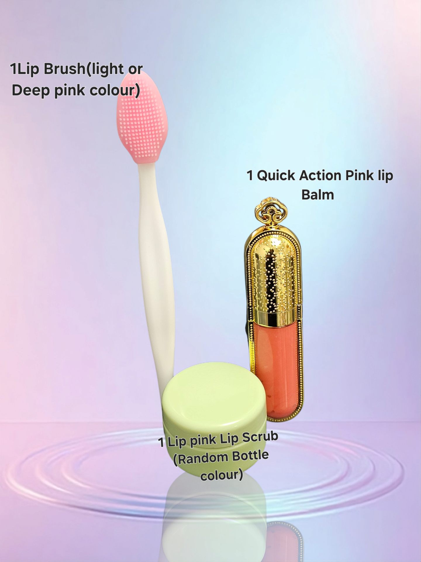 | Pink lip set | 6n1 set, 3n1 set, brush and scrub, Pink lip balm only |